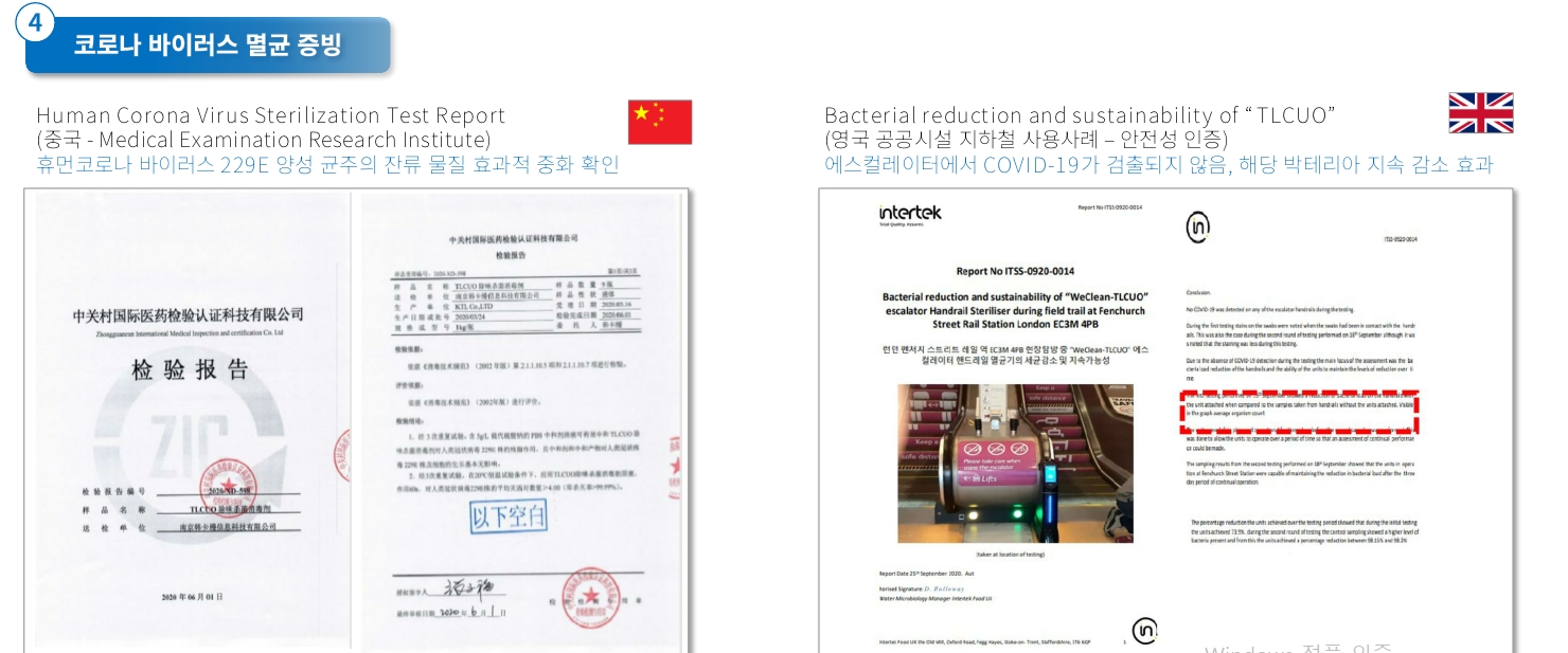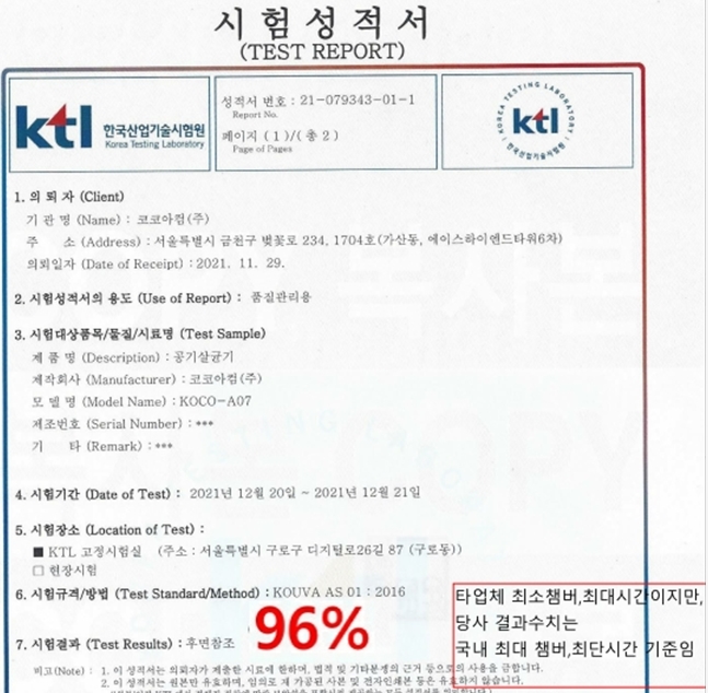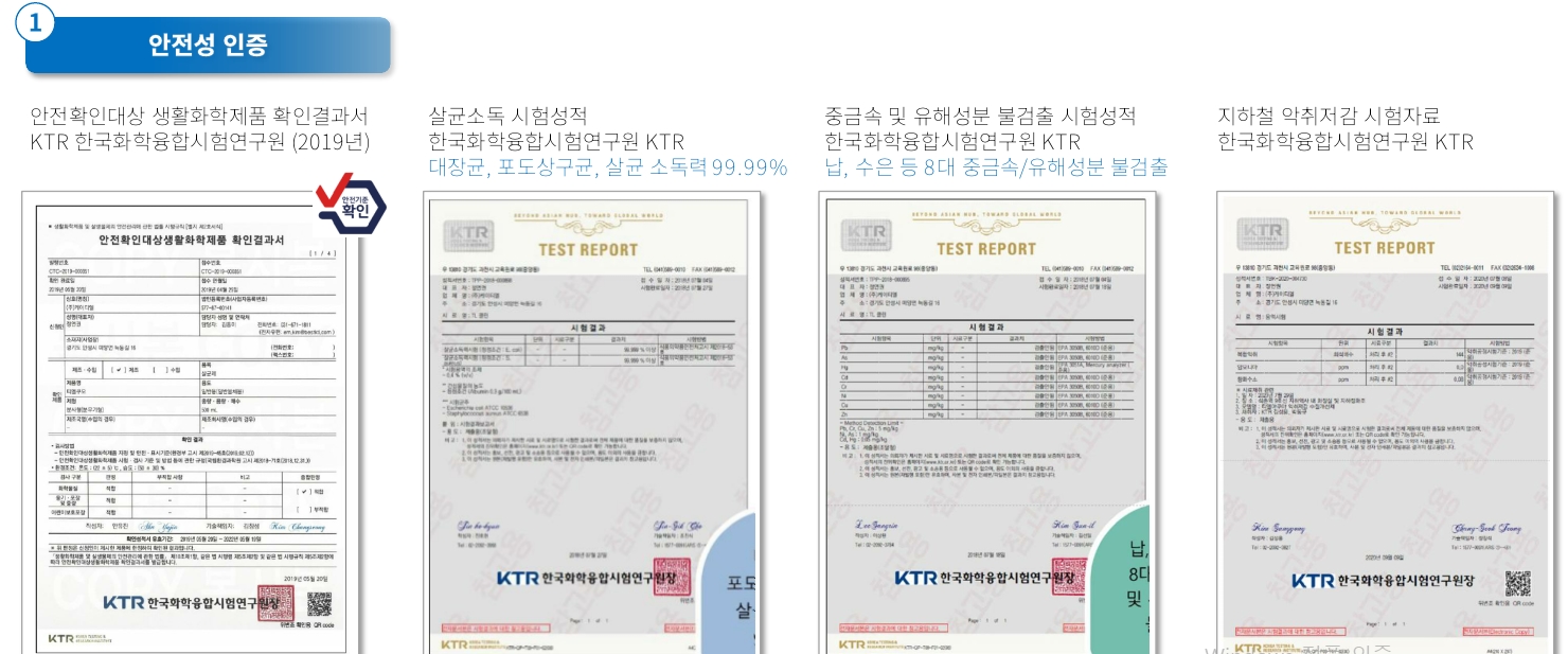 가장 안전하고 믿을수 있는  '공기중 부유 세균 저감실험'을  한국산업안전기술원 등의 성적을  획득했습니다.